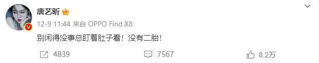 此前,唐艺昕被拍到小腹隆起被传怀二胎,其在社媒上发文辟谣。